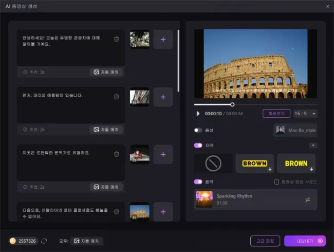 매력적인 고품질 콘텐츠를 자동으로 생성하여 매력적인 동영상을 제작합니다.