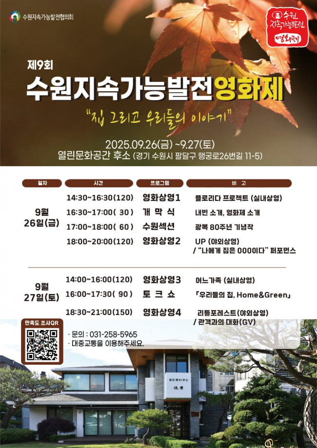 수원지속가능발전협의회가 주최하는 제9회 수원지속가능발전영화제는 삶의 공간으로서의 집을 새로운 시각에서 바라보며, 지속가능한 도시와 공동체의 의미를 살펴본다.