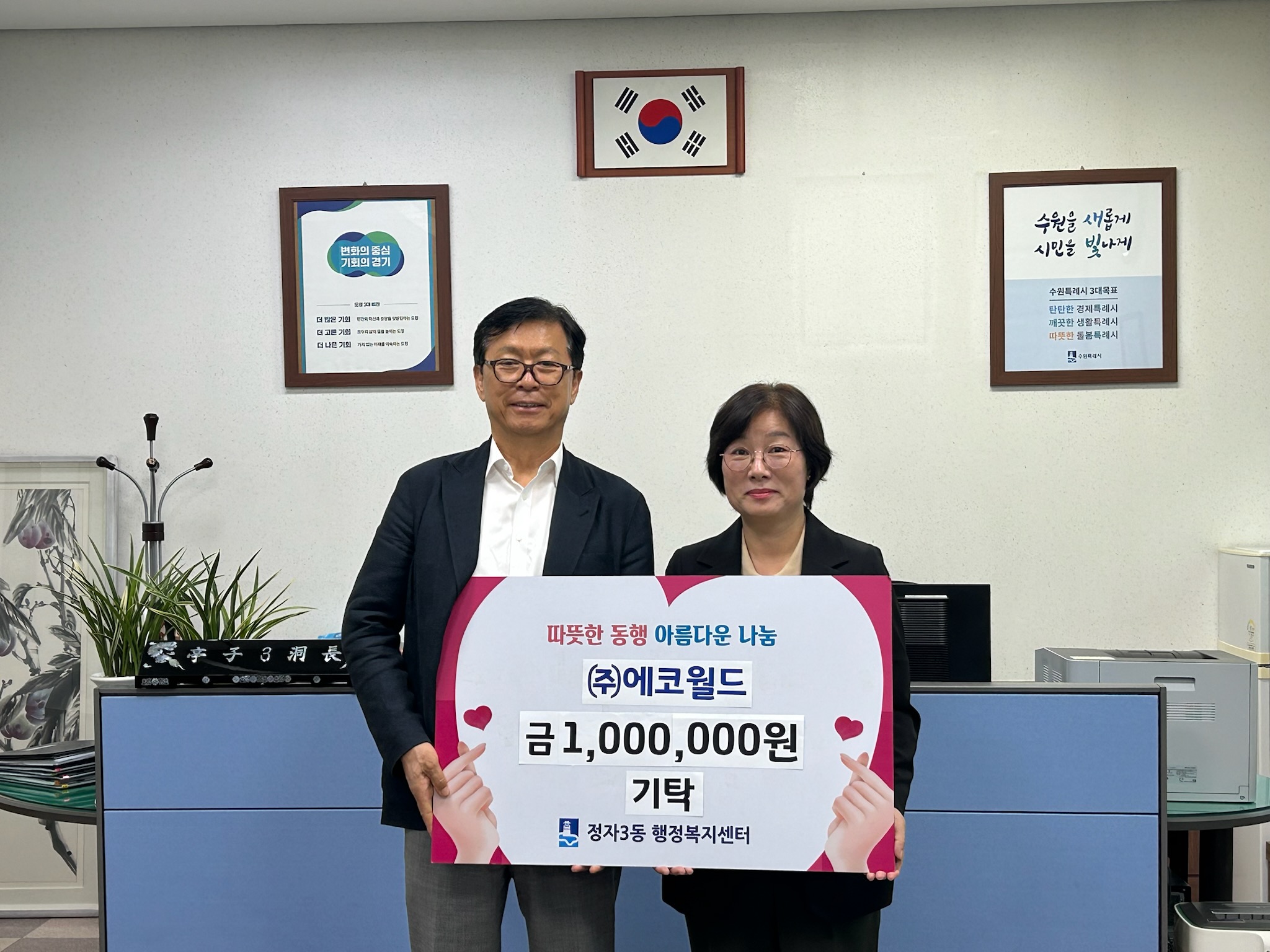 주식회사 에코월드는 지난 29일, 추석 명절을 앞두고 수원시 장안구 정자3동에 이웃돕기 성금 100만원을 기탁했다. 이번 기부금은 명절을 맞아 도움이 필요한 우리 이웃들에게 소중히 전달될 예정이다.